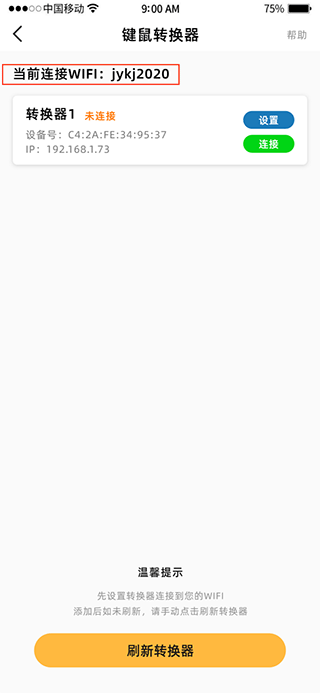 返回后,请检查键鼠转换器是否成功连接WIFI,具体可参照图示(若连接成功却未显示转换器,点击【刷新转换器】按钮即可)。完成上述操作后重新连接,就能在云电脑或云游戏里正常使用键鼠设备了~