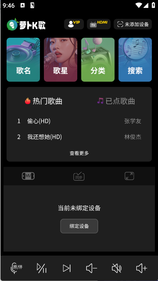 萝卜K歌,可以在手机上面进行k歌的软件,超级多的音乐曲库资源,按照歌名歌星进行分类,需要绑定设备才可以正常k歌,另外所有的音乐资源都是免费的,不需要任何的会员,高清流畅的播放模式带给用户不一样的听觉体验。