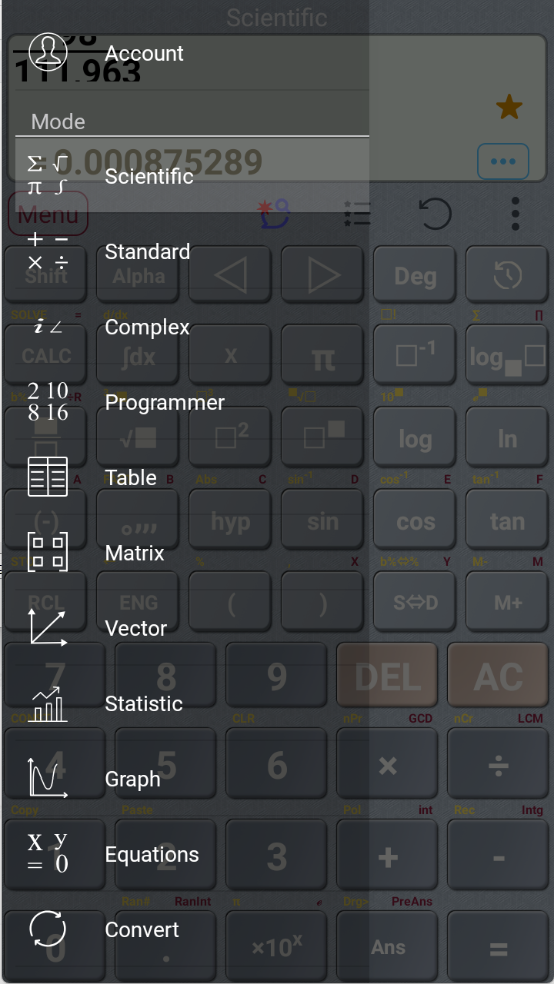 3、选择好之进入计算页面,有三角函数计算、对数计算以及基本运算等等,点击菜单按钮就查看更多的的计算公式。