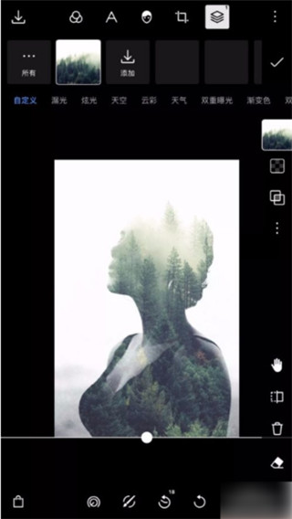 3、用户更换不同素材可以得到不同视觉效果,越暗的区域融合得越明显,你可以自由调节透明度、曝光强度等参数,打造个性化的双重曝光风格。