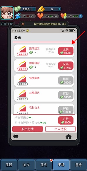 游戏里的投资功能挺关键的,手头有钱就去买股票,多数时候都能赚到收益。
