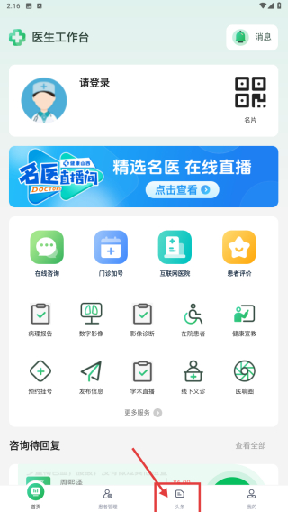 1打开提供医疗相关服务的应用程序后,找到界面底部的头条板块入口并点击,即可进入对应的头条展示页面。