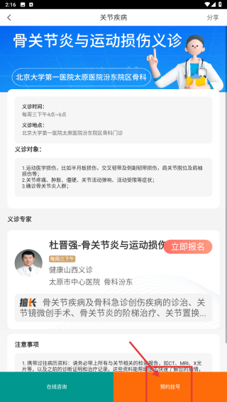 4、进入义诊详情页面后,点击预约挂号按钮,即可完成义诊的预约流程。
