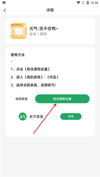 4全部操作结束后,找到并点击“前往搜狗设置”的按钮,接着依照指引依次进入“我的皮肤”板块下的“作品”页面,选中刚才制作的皮肤并点击启用就能完成整个流程。