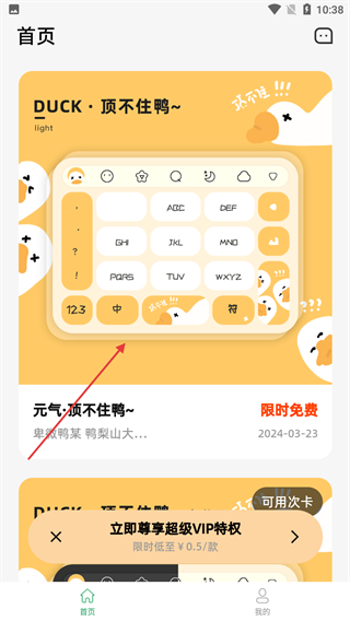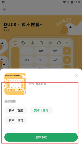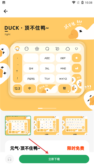1、在键盘皮肤的首页,找到你喜欢的“元气·顶不住鸭~”键盘皮肤板块并点击,即可进入该皮肤的详情页面。