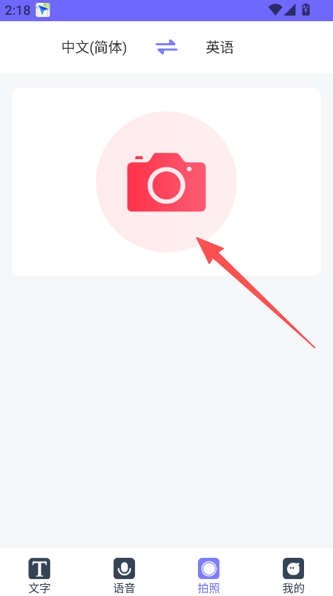 3、选择拍照翻译功能,点击相机图标,拍摄需要翻译的内容即可完成翻译操作。