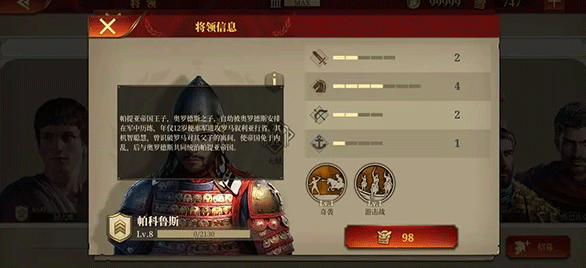 2、非氪金玩家适用的222阵型,具体组成如下:98与贝利撒留搭配、维钦托利和庞培组合、米特拉达梯及德鲁苏斯配对。