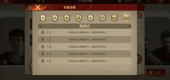 2、指挥官的成长路径为:队长→军士长(需30枚勋章)→百夫长(需55枚勋章)→千夫长(需90枚勋章)→军团长(需150枚勋章)→将军(需245枚勋章)→元帅(需380枚勋章)→执政官(需575枚勋章)