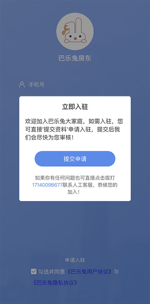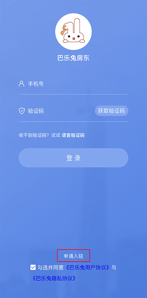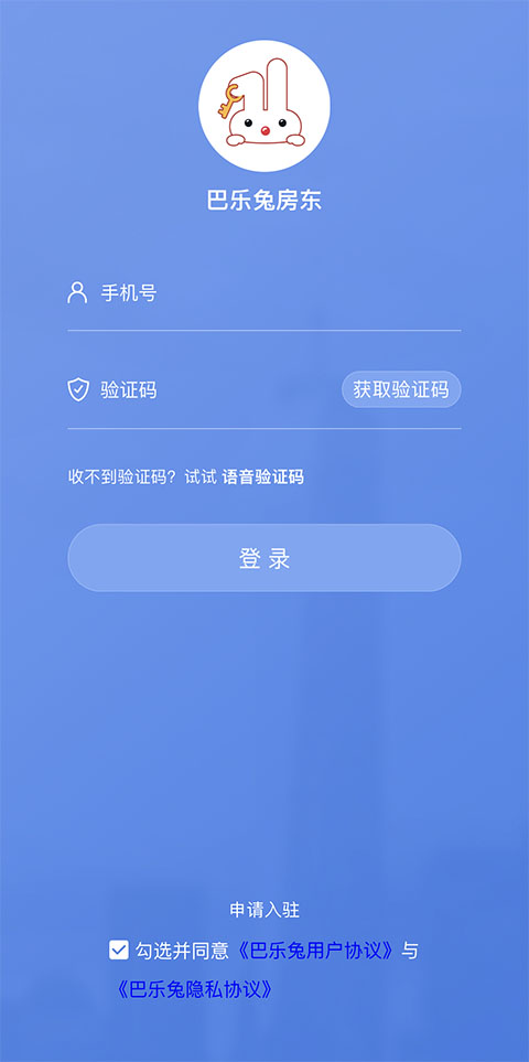 1、首先打开巴乐兔房东版应用,已经完成入驻的用户直接登录账号即可