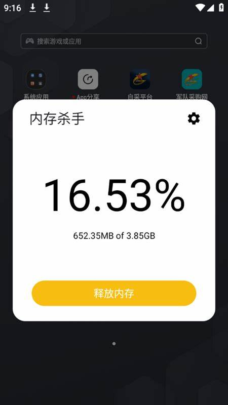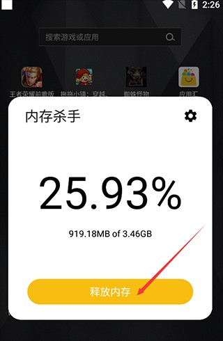 1、在手机上安装好内存杀手后,点击桌面的软件图标就能启动软件进入主界面。 2、进入内存杀手应用后,点击“释放内存”按钮,系统会自动开展内存清理工作,让设备运行更流畅。