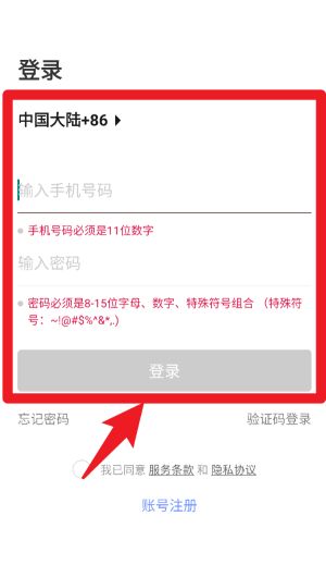 1、在登录页面输入11位手机号码和满足要求的密码,勾选相关协议后点击“登录”按钮,就能完成账户登录操作。