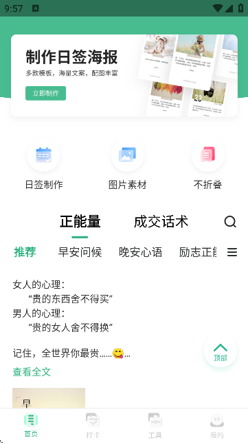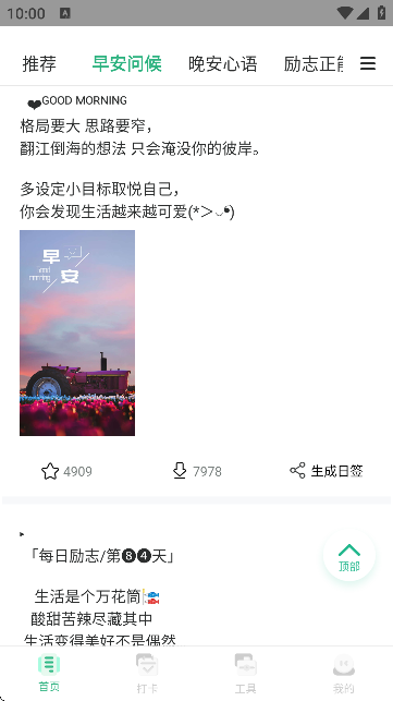早安语录是一款融合了正能量文案推荐、日常心情表达与高清美图打卡功能的知性文字应用,每天为用户送上一句励志又暖心的早安文案,助力大家开启元气满满的一天。