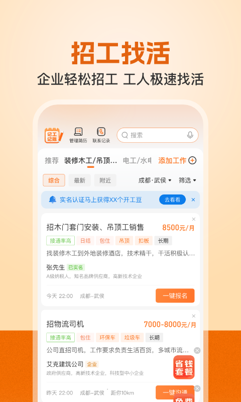 建筑工地找活:优先呈现周边工地的招工信息,为工友提供更多挑选好工作的机会;