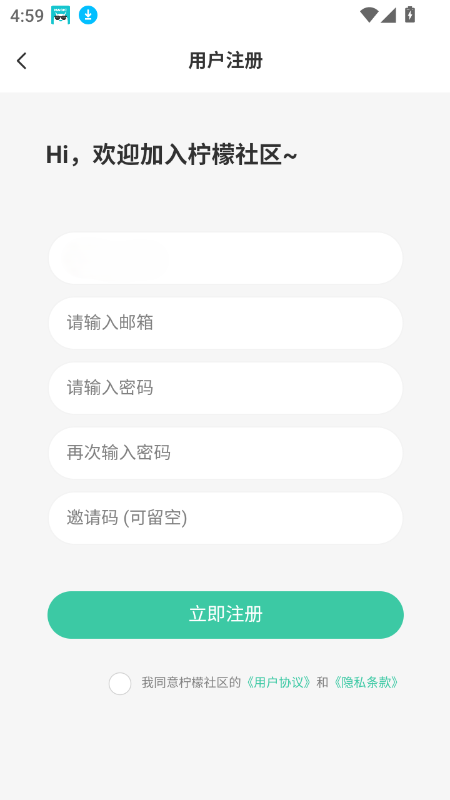 1、安装柠檬社区,打开应用后点击“同意并接受”;