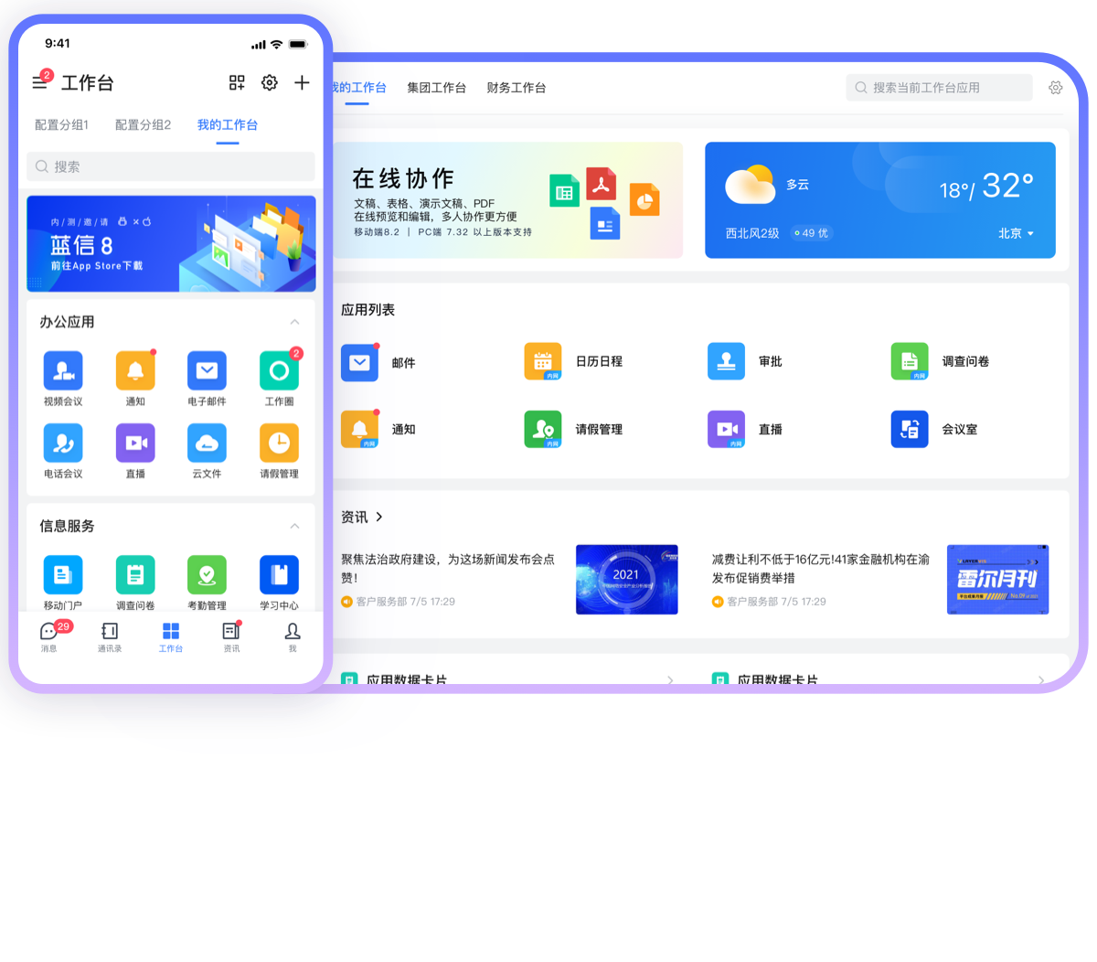 实现“五个统一”,即信息展现、消息提醒、通讯录、应用入口、审批待办的统一,并打通PC端与移动端的数据同步,以此打造统一办公门户。