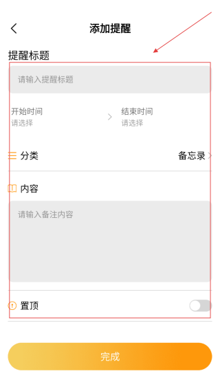 3、进入添加提醒的界面后,填写【提醒标题、时间、分类、内容】这类信息。