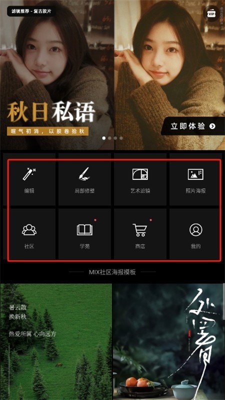 1、首先在本站完成MIX滤镜大师软件的安装,启动软件进入主界面后,用户能在首页看到“编辑”“艺术滤镜”“照片海报”等多个功能入口;