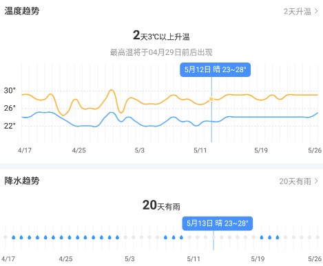 2、未来40天的天气信息会实时更新,便于大家规划各类活动与出行安排。