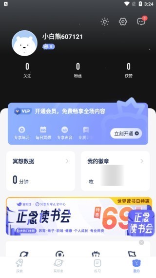 1、打开冥想星球软件,点击页面右下角的“我的”选项,跳转至你的个人主页界面。