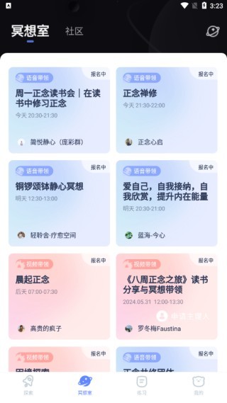 用户可在该板块查看多个冥想室,挑选心仪的房间开启冥想之旅。