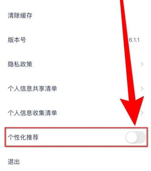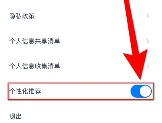 3、进入设置页面后,找到“个性化推荐”选项,点击其旁的圆形按钮完成相关操作。