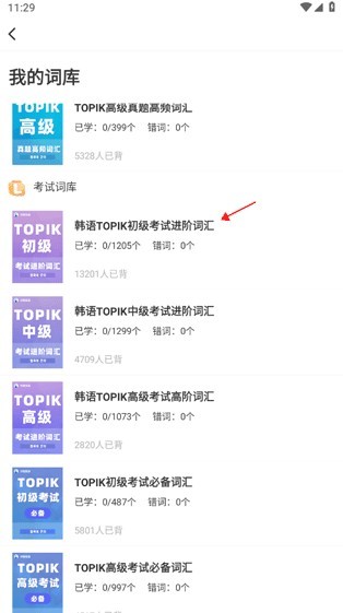 2、点击进入后,打开的页面会呈现多个不同分区的词库,涵盖延世教材、常用词库等类别,若用户有韩语备考需求,选择“考试词库”即可。