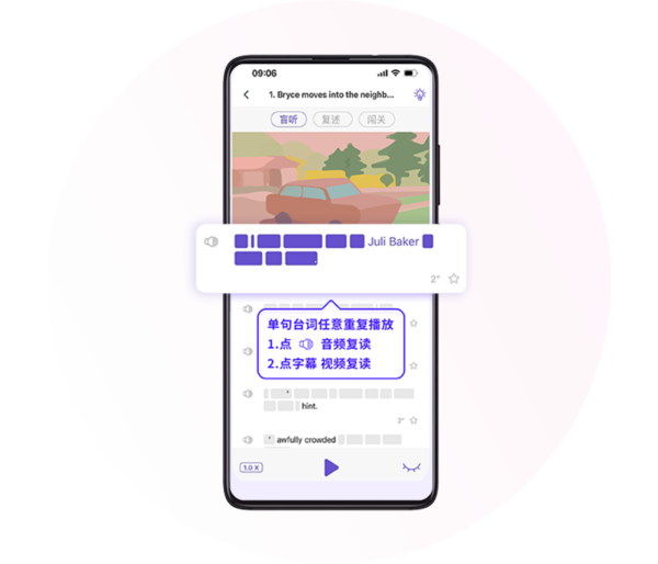 3、配备分级隐藏字幕单词功能,减少对文字的依赖,帮助用户培养语音思维能力。