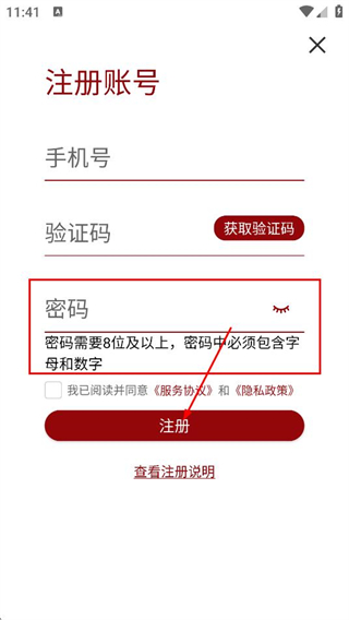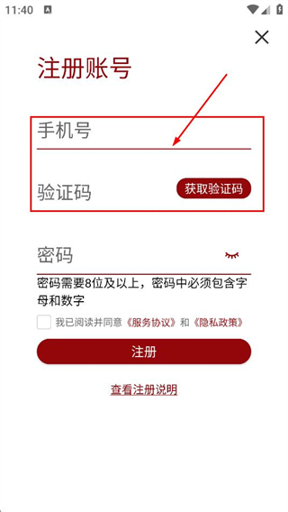 4在账号注册界面,先填写手机号码,再点击验证码获取按钮,最后输入收到的验证码。