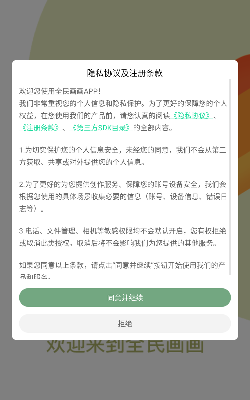 1、打开已安装完成的全民画画应用,同意其中的用户协议以及隐私政策。