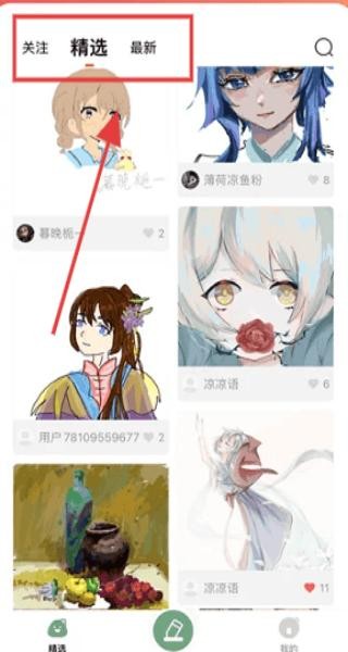 1、全民画画的首页设有【关注】【精选】【最新】三大板块,人物、风景、静物等各类画作应有尽有,若想寻找创作灵感、参考他人的绘画作品,只需滑动页面就能轻松浏览!