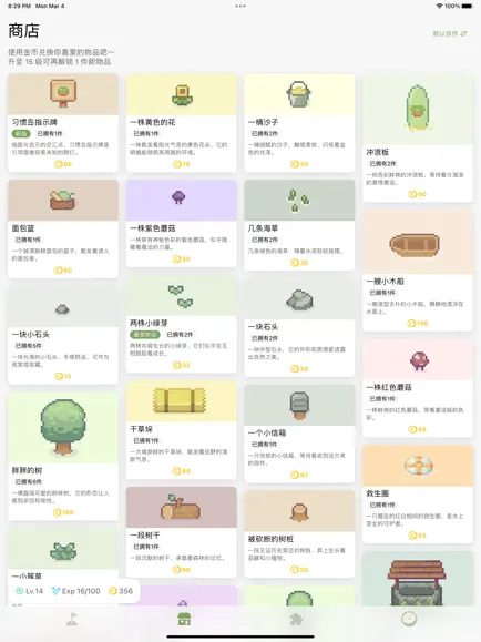 4、用户还可以通过完成习惯任务获取奖励金币,然后到商店里兑换各种精美的小岛装饰物品。