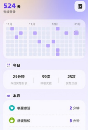 4、系统会对用户的冥想数据与反馈进行记录,方便用户随时查看自身的冥想进展与成果,从而助力用户更顺利地进入舒缓的冥想状态。