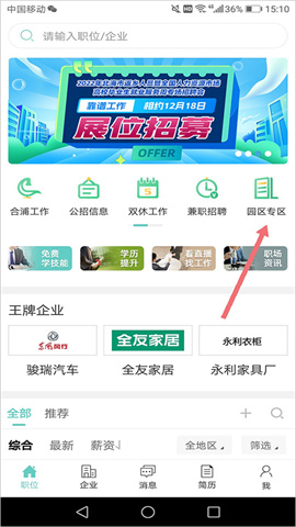 想找工作的人可以访问北海365招聘平台,进入职位板块后,找到并点击园区专区入口(具体位置可参考图示中红色箭头标注的区域)。