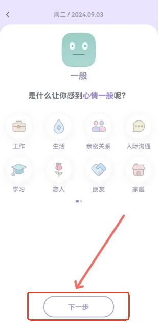 3、在确认情绪标签和内容都准确无误后,点击“下一步”按钮,就能完成日记的情绪记录环节。