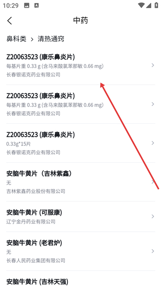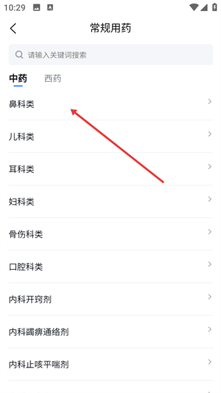 3在常规用药的界面中找到并点击鼻科相关的分类选项,即可跳转至中药鼻科类别的专属页面。