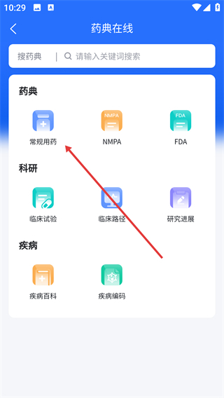 2、在药典在线页面找到并点击【常规用药】选项,即可进入常规用药页面。