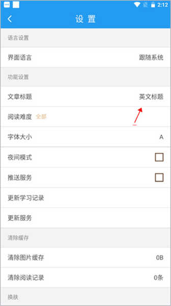 3、进入“功能设置”页面,找到“文章标题语言”这一选项,其初始默认的设置状态为中文。