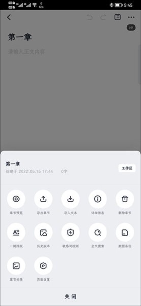 8、百灵创作软件的编辑界面也集成了不少实用功能,在目录旁有个三点图标,点击即可展开功能菜单。其中包含章节预览、导出章节、导入文本、查看详细信息、删除章节以及一键排版等多项功能。
