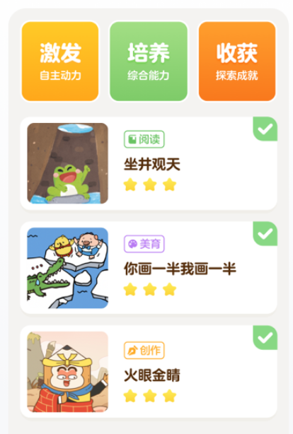 4、学习内容细分为多个模块,涵盖语言、艺术、科学等领域,培养多种能力。