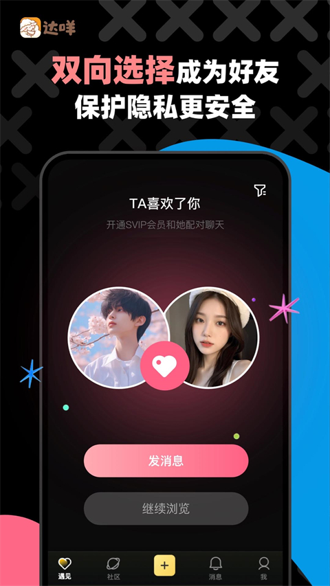 达咩是一款主打真实、安全、高效匹配的全新社交应用,秉持“拒绝套路,告别无效社交”的核心理念,提供开放式匿名社区、兴趣标签匹配、社区排位机制、双向互选聊天等多元功能。唯有双方彼此心动才能解锁聊天权限,从根源上减少骚扰行为,打造绿色、安全且充满趣味的社交空间。此外,平台积极倡导文明互动,坚决抵制照骗与低俗内容,通过用户审核机制,携手共建优质社区生态。现在就加入达咩,开启专属于你的精准社交新旅程!