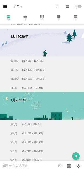 -支持日、三日、周、月四种视图模式,时间轴采用上下滑动设计,风格与Google日历相似。