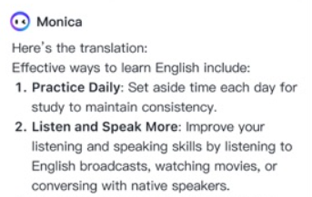 3、具备语音翻译能力,用户能够用自己的母语和Monica交流对话。