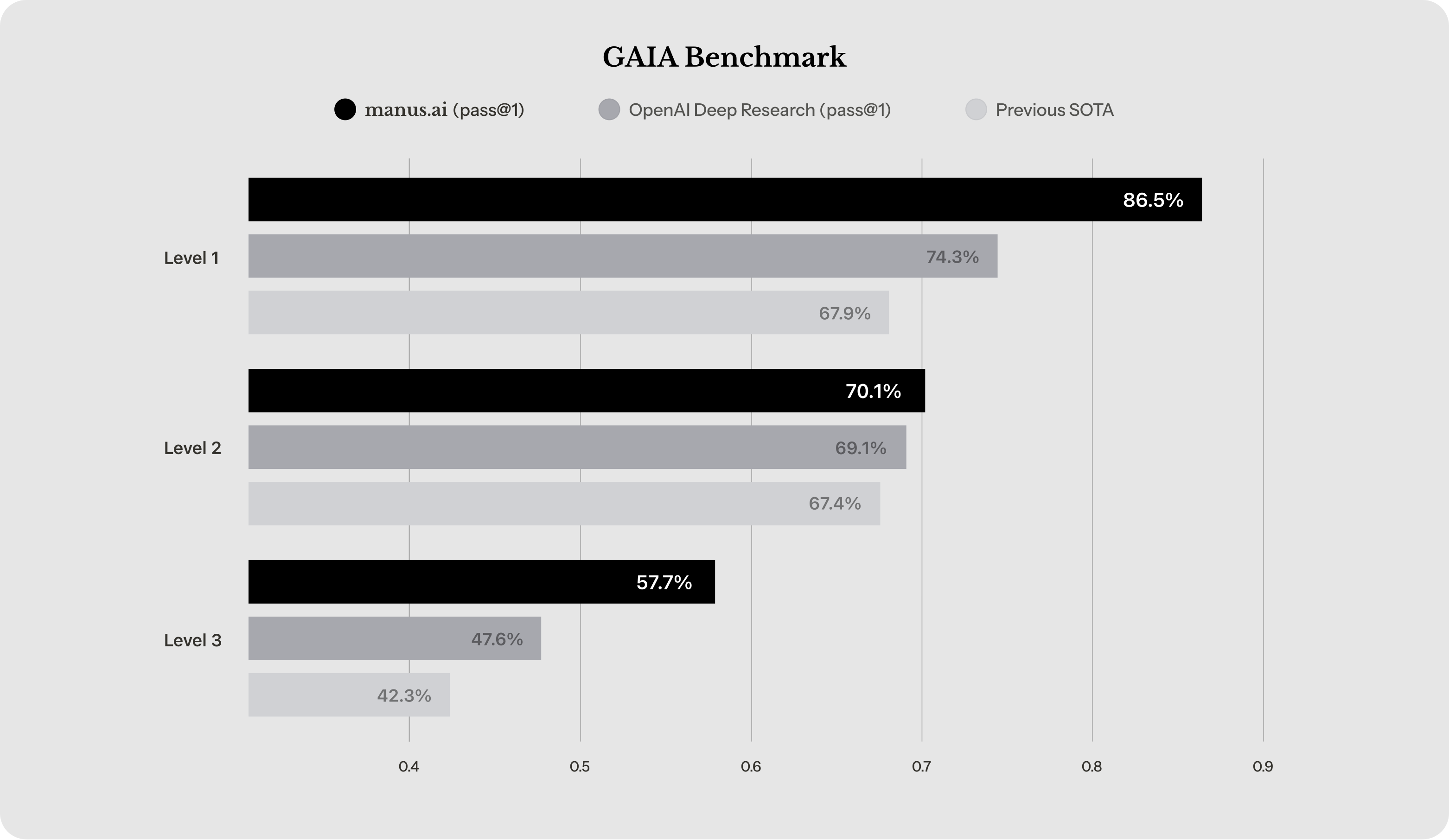 Manus在GAIA基准测试中表现优异,取得了SOTA(State-of-the-Art)的成绩,超越了OpenAI。这一结果证明了Manus在解决现实世界问题上的卓越能力。GAIA是一个用于评估通用AI助手处理实际问题能力的专业基准测试,而Manus在该测试的三个不同难度级别中均展现出了出色的表现。