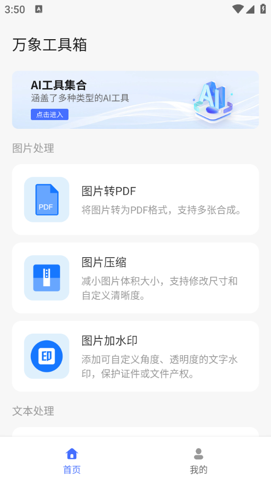 2、在首页的工具合集中,可根据实际需求选择图片处理、文本处理或设备信息查询等多种功能选项。