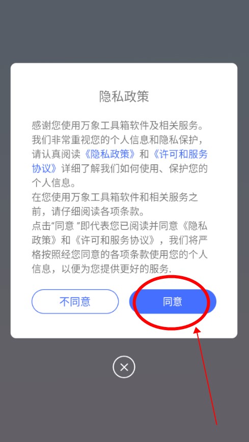 1、启动万象工具箱手机应用,阅读并同意相关的政策及协议内容。