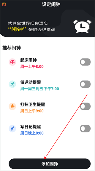 2、专注时钟为用户提供了各种推荐闹钟,用户也可定制专属闹钟,点选下方的“添加闹钟”开始定制。
