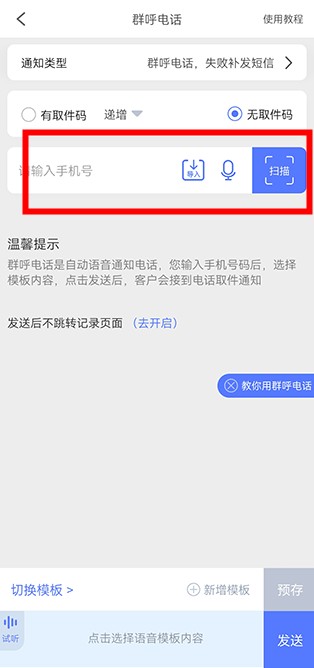 一次导入多组号码,系统自动拨打语音提醒取件。
