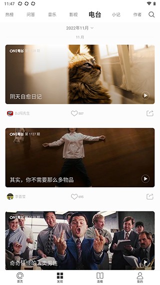 3、点击进入【发现】板块,浏览各类专栏内容,涵盖阅读、图文、专题、热搜榜、问答、音乐、影视等多个类别。