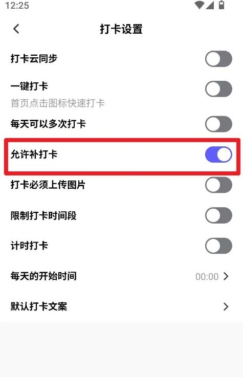 5、成功进入打卡设置界面后,点击打开【允许补打卡】开关即可完成设置。