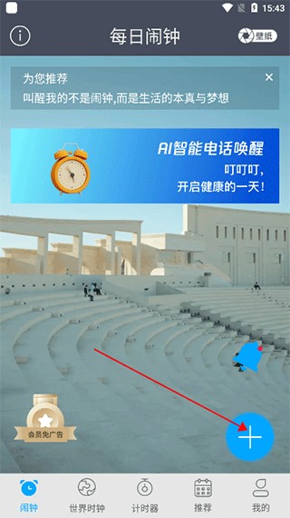1、打开进入每日闹钟的闹钟界面,选择右下方的+图标设定新闹钟。